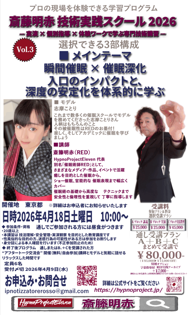 本サイトでは、斎籐明赤の催眠技術・研究・教育活動を軸に、以下のセクションに分けて体系的にご紹介いたします。